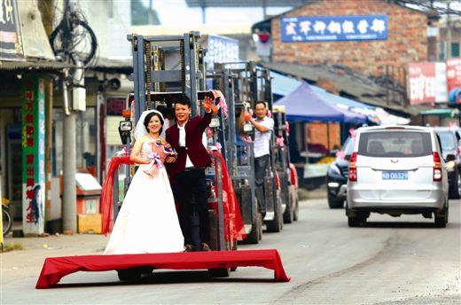 1014日,廣西。一輛南京龍工3電動叉車叉著裹有紅布的木板,載著一對新人駛上送親的道路,引得街坊市民紛紛圍觀。