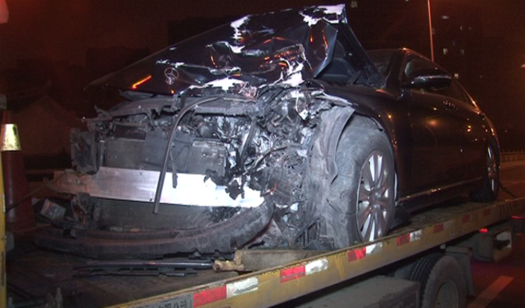 橋上行駛車速快 百萬奔馳撞飛馬鞍山叉車40多米
