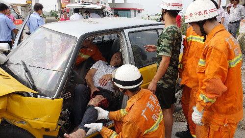 據介紹,消防官兵趕到現場時看到,事故現場一片狼藉,一輛蕪湖叉車與一輛車牌為粵Q186xx的陽江出租車相撞,出租車車頭、駕駛室車門受到擠壓嚴 重變形,司機乘客3人受傷被困。其中司機傷情較重,左側大腿被叉車貨叉所傷,傷口長約30厘米,寬處約10厘米,大量出血,血跡浸透駕駛座位。后排座還 有1名女子右膝蓋受傷被困,另一名約70歲的老人受傷因疼痛暈厥,情況緊急救援工作刻不容緩。