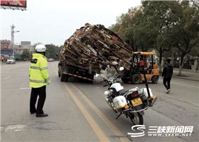 此時,一輛小型南京叉車碰巧從該路段經過,見到這一情況后,叉車駕駛員便主動駕車試圖扶正紙箱。由于功率不足,南京叉車僅能保證貨物不進一步傾斜,卻無力將 貨物扶正(如圖)。這時,當陽交警玉陽中隊巡邏民警路過發現情況后,聯系施救車輛到現場進行救援,并要求貨車駕駛員迅速聯系其他貨車,將超載的紙箱按規定 裝載后轉運。