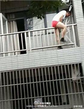 當(dāng)天下午2時31分,劉先生和趙先生在樓下散步,突然發(fā)現(xiàn)有一名男子從二樓一間公寓的陽臺溜出,出于好奇他拍下了這段長約59秒的視頻。