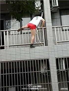 昨日,租住在青山區(qū)一冶廠前單身公寓的劉先生,在小區(qū)散步時,拍下一段驚人的視頻:一名男子赤身裸體,僅僅穿著一條紅色內(nèi)褲,慌里慌張出現(xiàn)在二樓陽臺,然后順著一根尼龍繩爬到一樓,奪路而逃。更讓劉先生感到吃驚的是,拍下視頻后他才發(fā)現(xiàn)男子竟是從自己房屋內(nèi)溜出來的。